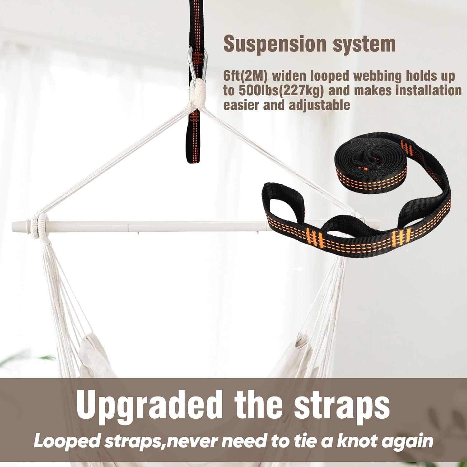 Versatility and Usability.Come with a strong strap and a iron carabiner.The strap is long enough and also with prefabricated loops without harming the material.Whether you want to enjoy a peaceful afternoon in your garden or create a cozy corner in your living room,can be easily installed both indoors and outdoors,in various settings such as gardens,patios,or even living rooms.They can accommodate different body types and offer a cozy spot for relaxation,reading,or even taking a nap.