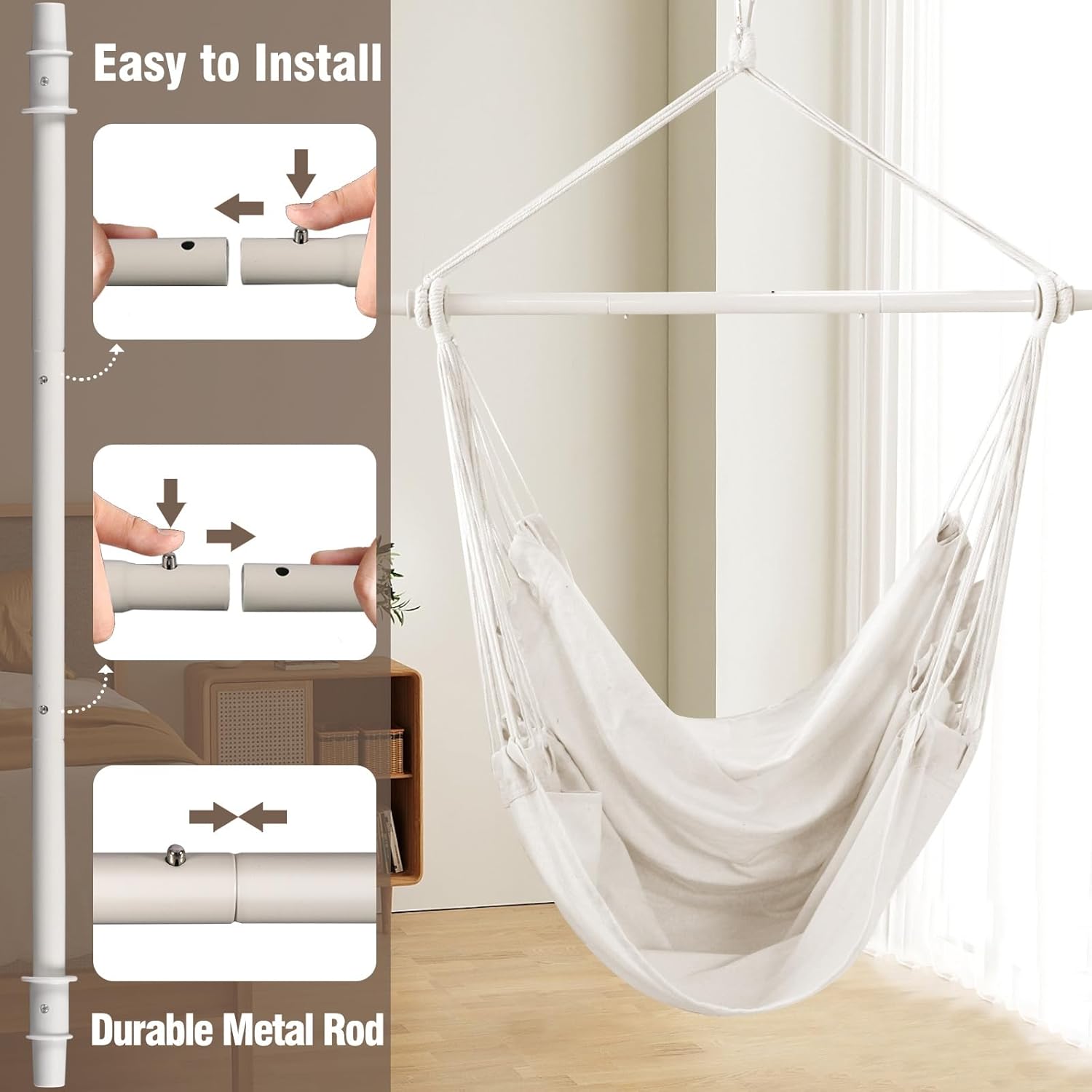 Compact and Portable.Whether you want to enjoy a peaceful afternoon in your garden or create a cozy corner in your living room,these chairs can be easily installed both indoors and outdoors.This hanging chair is equipped with a collapsible spreader bar and a drawsting bag,which can pack all the accessories into when not in use.Their lightweight and portable design make them convenient to move and set up wherever you desire, providing you with a comfortable seating option wherever you go.